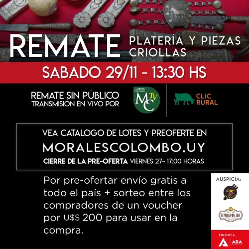 - El remate es sin público, 100% virtual y se transmite en vivo por internet a través de Morales Colombo tv (www.moralescolombo.uy – pestaña «Remate en vivo» y Clik Rural para poder participar y comprar en vivo por los distintas lineas telefónicas habilitados en pantalla.