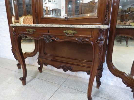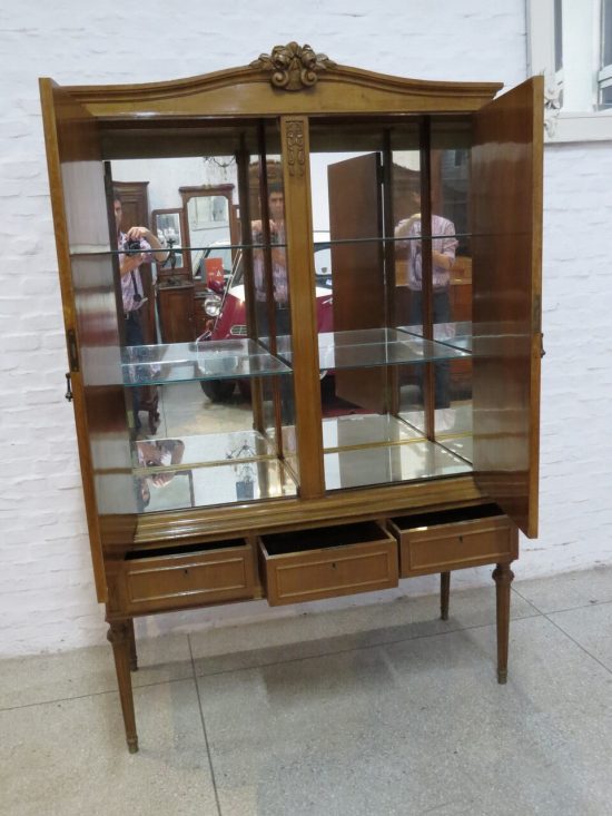 Buen cristalero Luis XVI, con 2 puertas, estantes de vidrio y espejos interiores, con 3 cajones, muy firme, con llave. Medidas largo 1.17, ancho 0.49, alto 1.82. Estimado U$s 320 - U$s 420