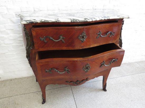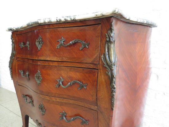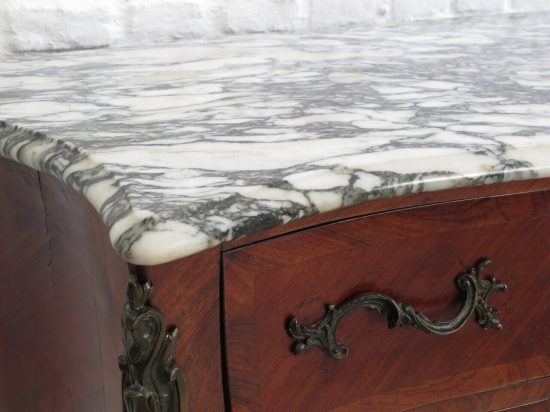 Muy buena comoda Regencia del S. XIX, enchapada en caoba e interiores en roble, 3 cajones, herrajes y decoraciones en bronce, con marmol veteado, medidas largo 1.00, ancho 0.46, alto 0.90. Estimado U$s 2.000 - U$s 2.800
