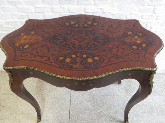 Mesa de centro estilo Regencia, en petiribi, con marqueteri, con un cajón y con detalles en bronce, medidas largo 1.03, ancho 0.63, alto 0.73. Estimado U$s 320 - U$s 380