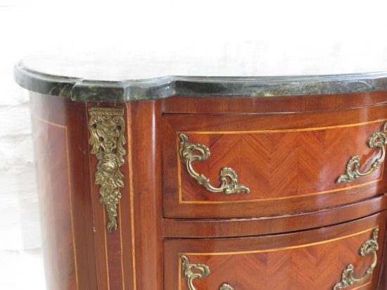 Muy lindo comodin con marqueteri y marmol negro, dos cajones y herrajes en bronce medidas largo 0.65, ancho 0.40, alto 0.84. Estimado U$s 600 - U$s 800