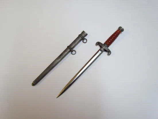Daga alemana de la Luftwaffe, segundo modelo, año 1937, sello "Alcoso" objeto histórico militar de la Alemania de la Segunda Guerra Mundial, usado por oficiales de la "Fuerza aerea", medidas largo total37 cm., hoja 25 cm. Estimado U$s 250 - U$s 300
